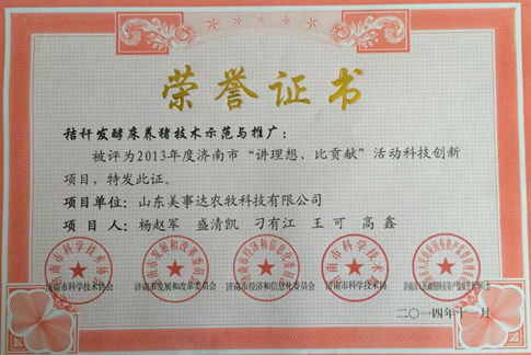 由山東美事達農牧科技有限公司承擔、楊趙軍等主持的“秸稈發酵床養豬技術示范與推廣項目”在由濟南市科學技術協會、濟南市發展和改革委員會、濟南市經濟和信息化委員會、濟南市科學技術局以及濟南市政府國有資產監督管理委員會共同舉辦的“講理想、比貢獻”活動中被評為科技創新項目,這也是我公司科技項目連續兩年獲此殊榮。下圖為五部門聯合頒發的榮譽證書。