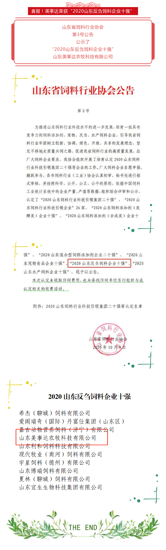 喜報!美事達榮獲“2020山東反芻飼料企業十強”