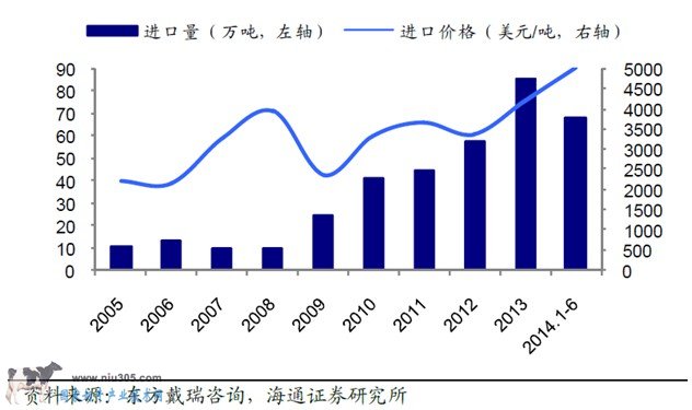 ? ? 巨大的懸殊差距,業(yè)內(nèi)將矛頭齊聲指向罪魁禍?zhǔn)住獙訉蛹哟a的經(jīng)銷(xiāo)商。因?yàn)榕俪鲋刀悺㈥P(guān)稅、運(yùn)費(fèi)成本外,剩下的錢(qián)合理解釋就是經(jīng)銷(xiāo)商拿去了。然而,海關(guān)數(shù)據(jù)顯示,2014年1-6月,我國(guó)進(jìn)口奶粉68.12萬(wàn)噸,同比增加75.08%,進(jìn)口平均價(jià)格為5,041美元/噸,同比上漲46%。
