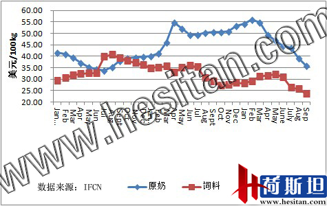 ??????? 另據荷斯坦了解,IFCN公布的全球飼料價格顯示,9月份全球飼料價格23.7美元/100Kg,合1.46元/Kg,環比下降8.1%,同比下降18.8%。