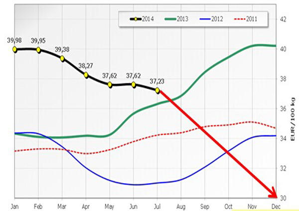 歐盟月度原料奶價格2011-2014