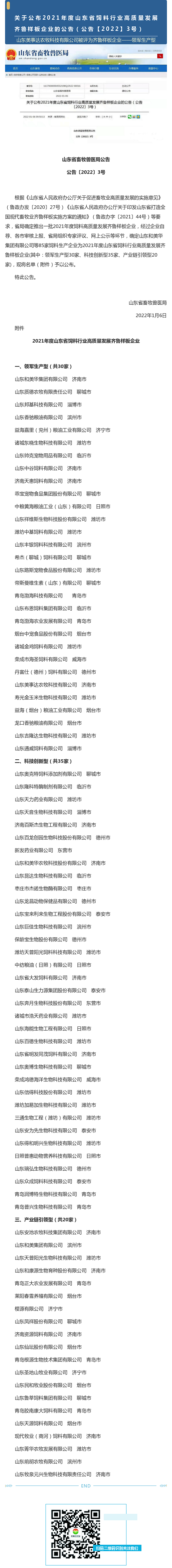 關于公布2021年度山東省飼料行業高質量發展齊魯樣板企業的公告(公告【2022】3號)